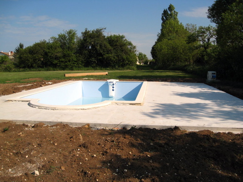 The technician arrived in the second week of April to commission the pool. This involved enabling the saltwater filtration system, the pompe à chaleur (heat pump) and demonstrating the regular maintenance and water testing/treatment steps. This photograph was taken from water level to omit the unfinished terrace and the rough surround pre-landscaping.