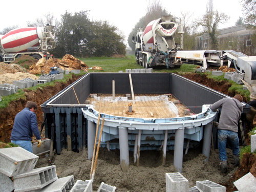 After the concrete had been poured the structure on which the liner hangs is now very strong. Reinforcing is used throughout, including down through the hollow panels that snap together to create the sides which are then also filled with concrete.